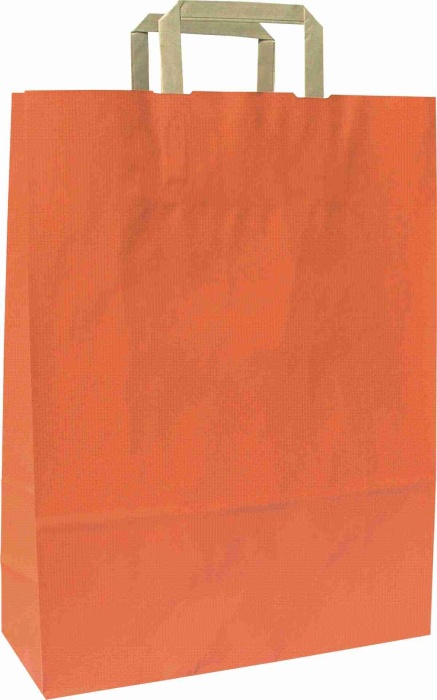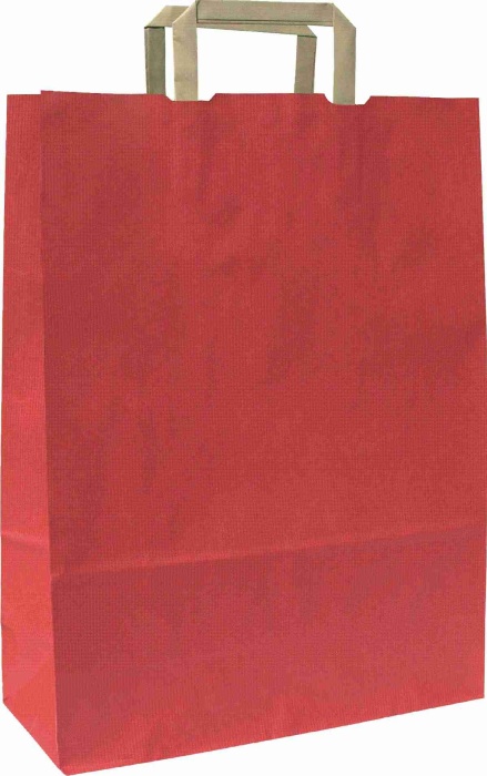 Papírové tašky o rozměru 180 x 80 x 250 mm,červené, hnědé ploché držadlo Červený tisk na hnědém sulfátovém papíru 100g.Hnědé ploché papírové držadlo. Vhodné pro potisk sítotiskem. Pořadí rozměrů: šířka x hloubka x výška.
